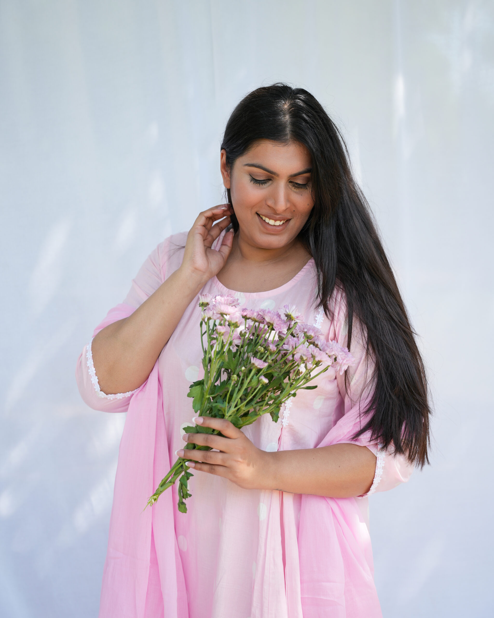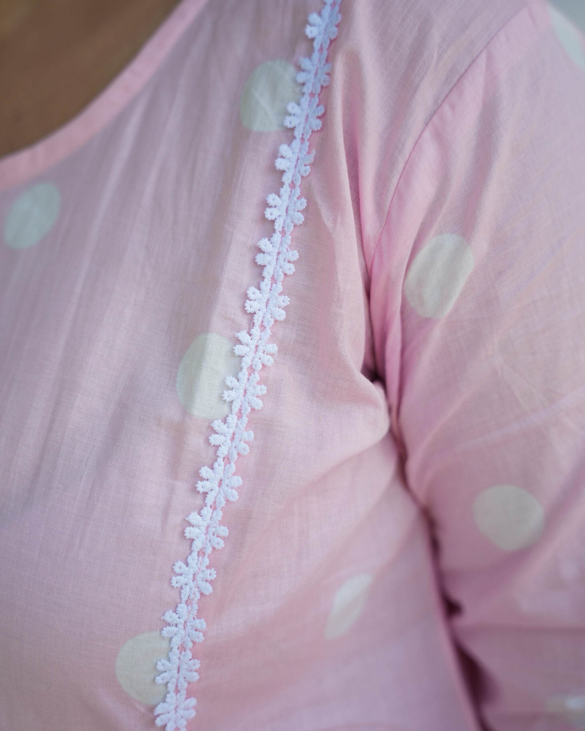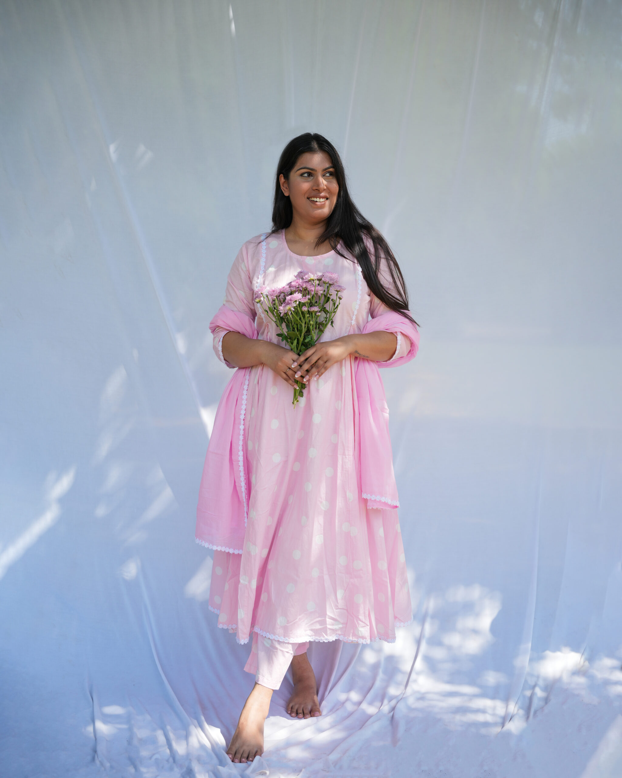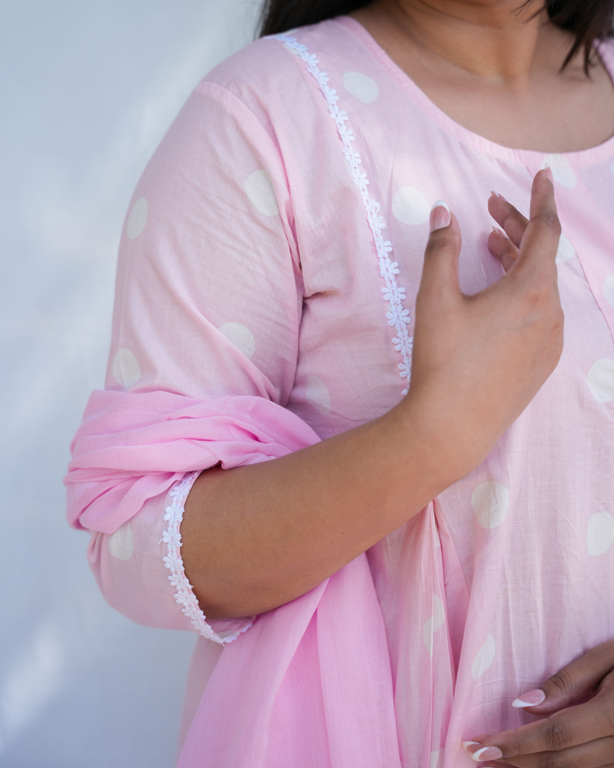 Effortlessly elegant and breezy, this Blush Pink Anarkali Set blends comfort with traditional charm. Crafted from premium cotton, it showcases exquisite Rajasthani craftsmanship, fine lace detailing, and superior dye and print quality for long-lasting vibrance. The soft polka print, flowy silhouette, and lace-trimmed dupatta make it perfect for festive days, casual outings, or everyday elegance.
