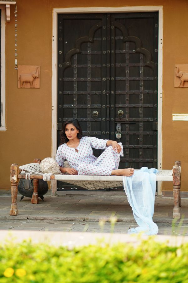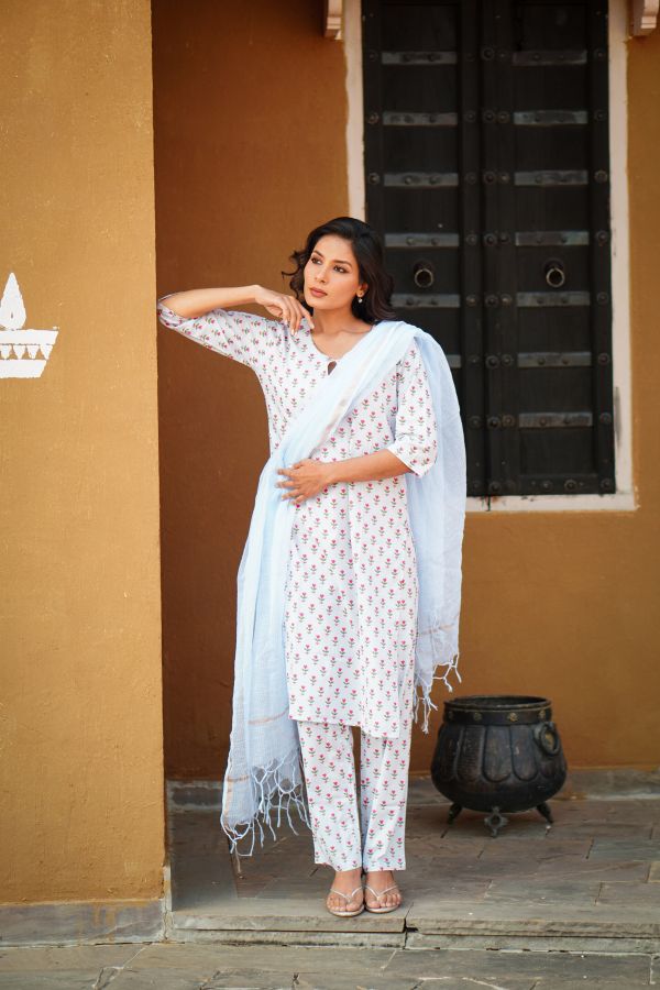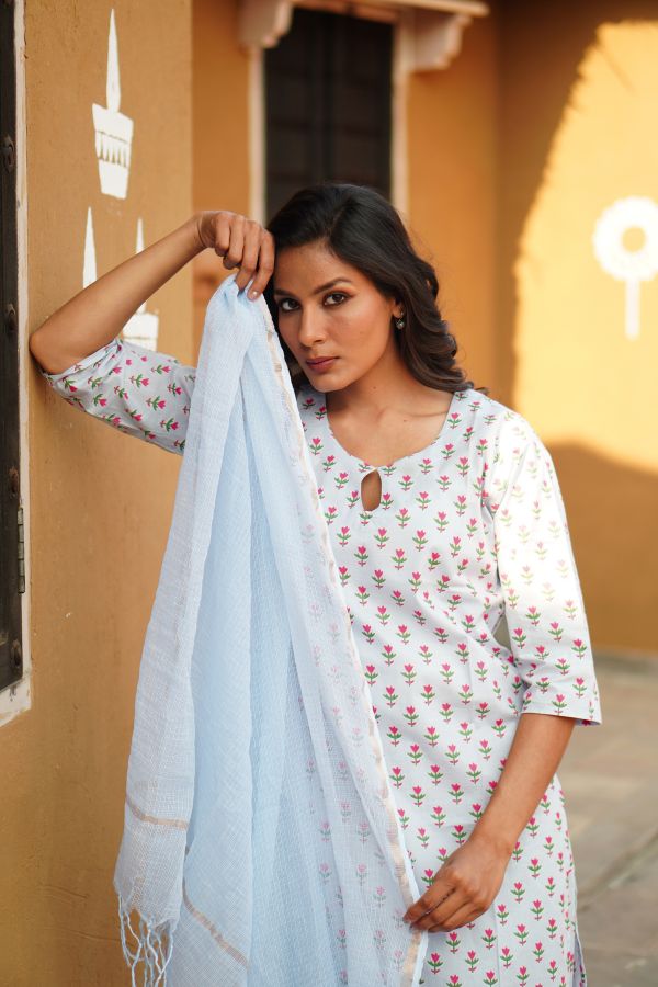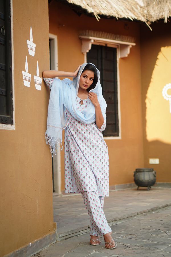 The Powder Blue Summer Bloom Cotton Kurta Set with Kota Doria Dupatta features delicate summer blooms and a breezy silhouette, offering effortless seasonal elegance and all-day comfort. Set featuring delicate floral prints, matching cotton pants, and a lightweight Kota Doria dupatta. Soft, breathable, and effortlessly elegant—perfect for workwear, casual outings, and relaxed festive dressing. A timeless ensemble designed to keep you fresh, graceful, and stylish throughout the day. Its soothing powder blue tone and airy fabrics make it a go-to choice for warm days, blending refined aesthetics with easy, breathable comfort.