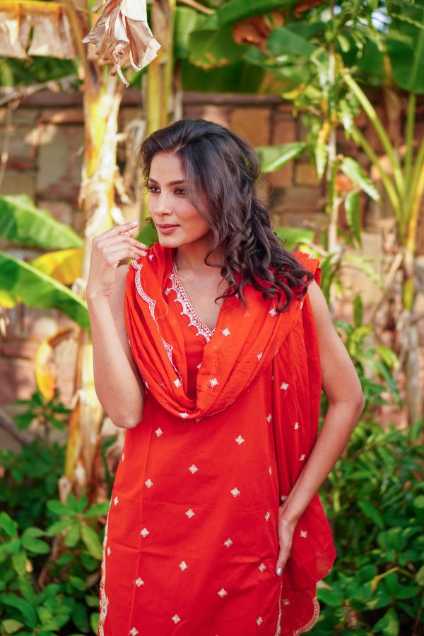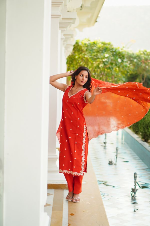 Elevate your everyday style with this Rust Embroidered Cotton Kurta Set With Dupatta, crafted from 100% pure cotton for breathable comfort. Featuring delicate embroidery, scalloped lace details, straight-fit pants, and a flowy embroidered dupatta, this ensemble blends effortless elegance with timeless charm—perfect for casual outings, brunches, and warm-weather events. A versatile addition to your wardrobe that transitions seamlessly from day to evening wear. The rich rust tone paired with intricate detailing adds depth and sophistication, making this set a refined yet comfortable choice for graceful, everyday dressing.