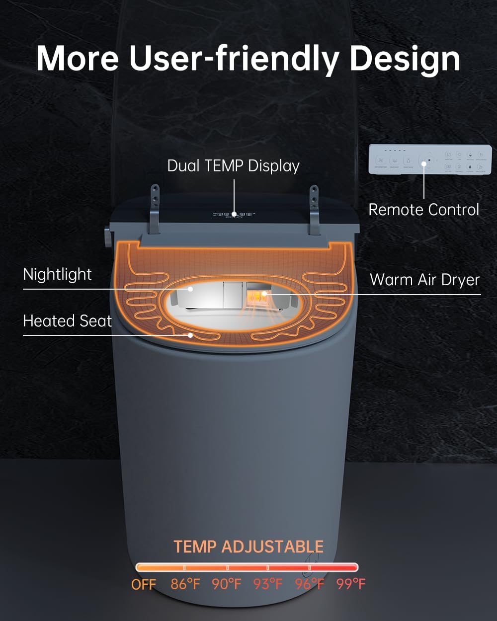 • Dual Flush with ECO&Luxury Toilet- Choose 1.6 GPF full flush or 1.1 GPF half flush to save water without sacrificing performance. Four-season TEMP sensing helps auto-adjust the heated seat, warm water, and warm dryer to ambient conditions, with added luxury features like nightlight, deodorization, warm air drying, and a dual LED display.